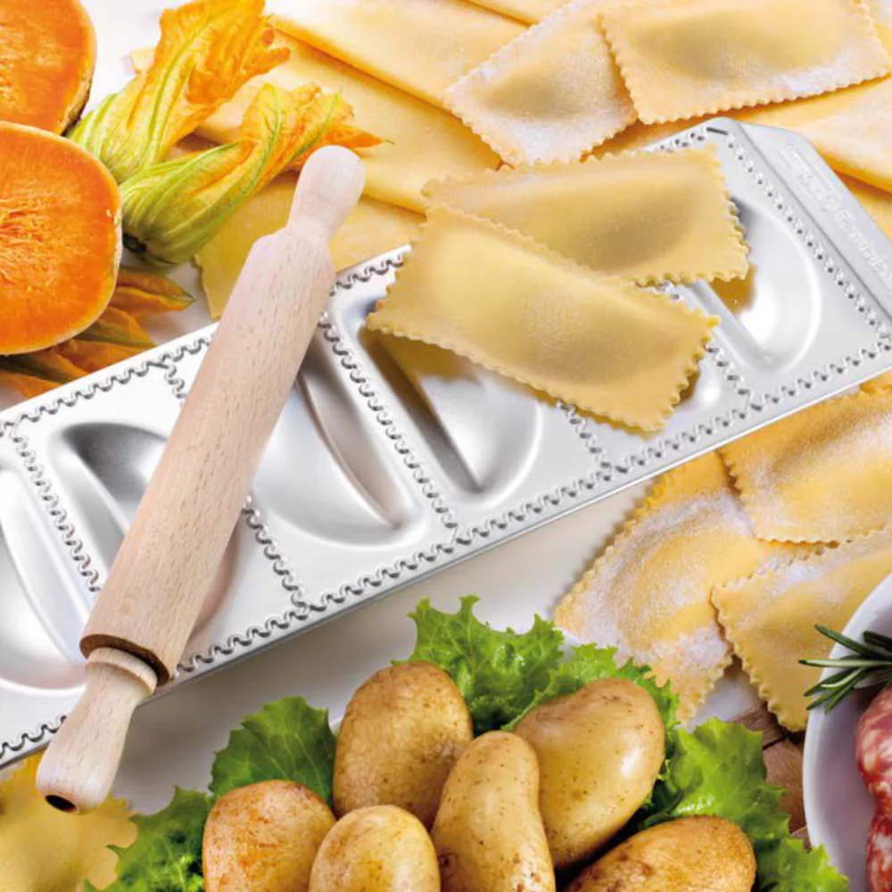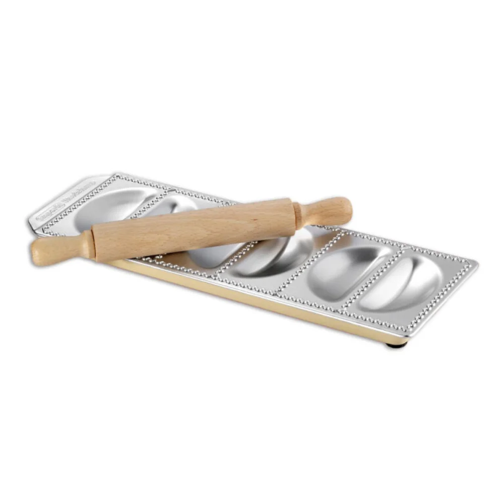 Make perfect raviolis every time with the steel and aluminum mold that makes 6 sorrisi raviolis with filling pockets. Included with the mold is a small wooden rolling pin that is the perfect size for finishing the pasta. Directions for use are included on the box.