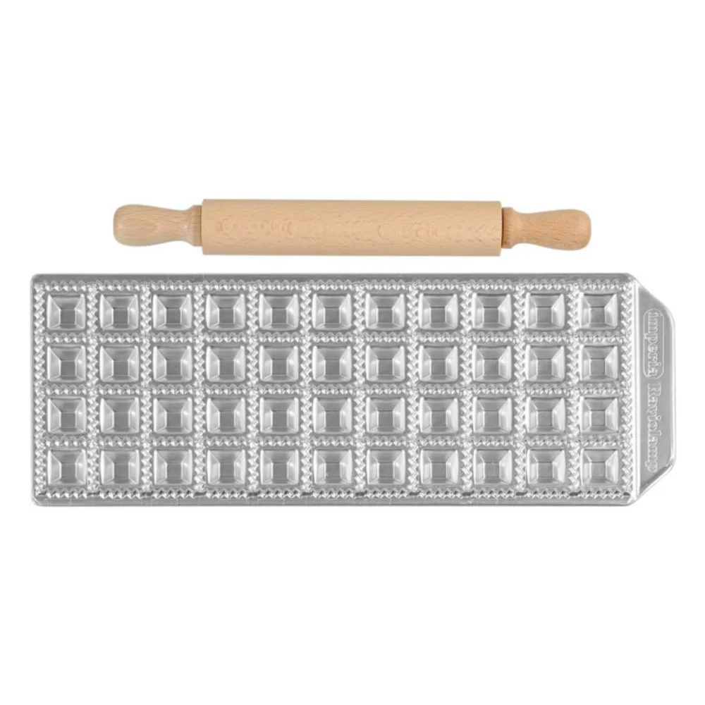 Make perfect raviolis every time with the steel and aluminum mold that makes 44 square raviolis with filling pockets. Included with the mold is a small wooden rolling pin that is the perfect size for finishing the pasta. Directions for use are included on the box.