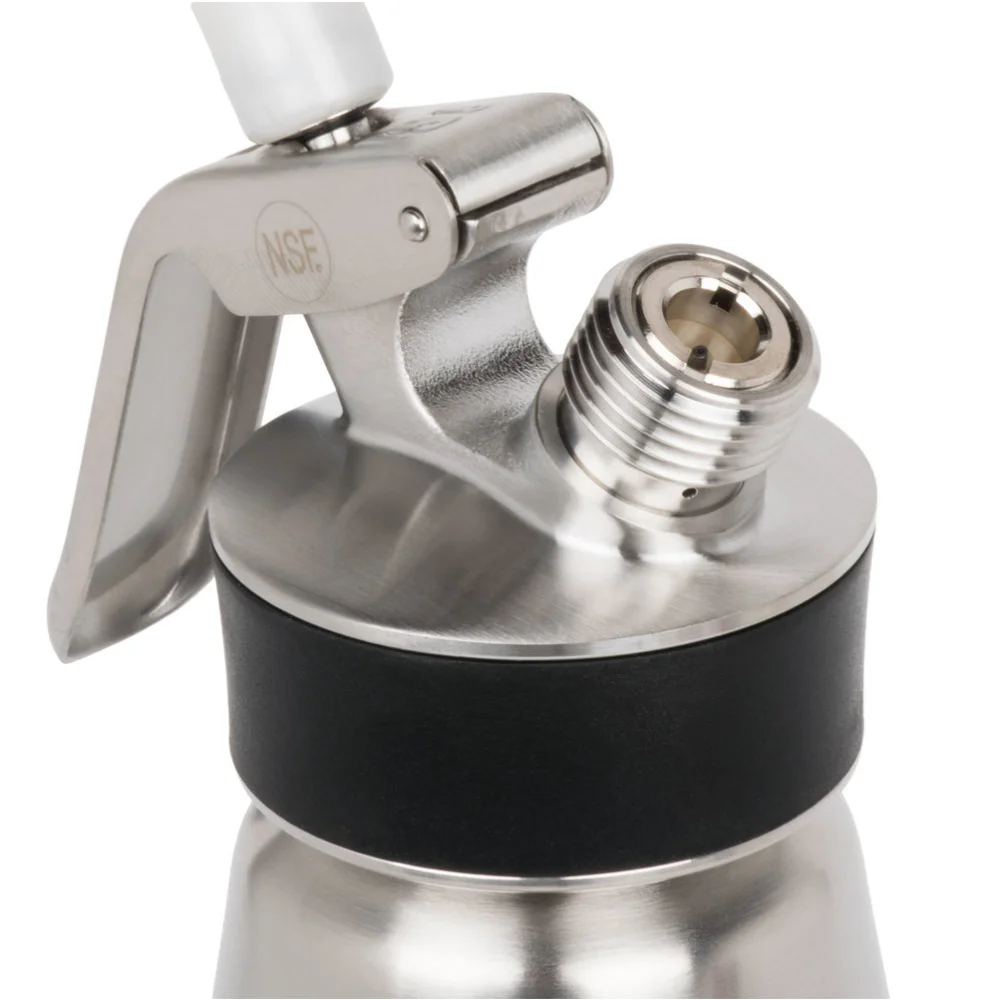 This cream whipper is available in two sizes (0.5L and 1.0L) and comes with a tulip style decorator tip and ergonomic charger holder.