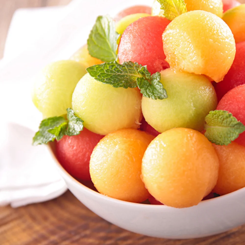 The triangle melon baller shapes fruit, vegetables and butter balls.